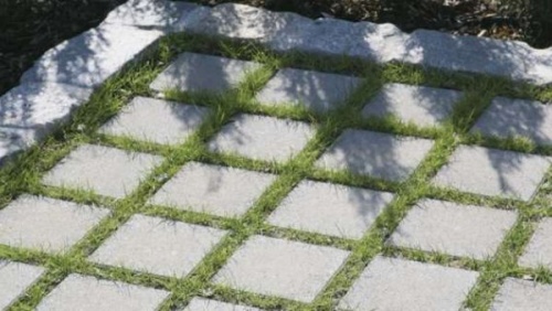 Elcsúszásbiztos térkőrendszer, hálós kötésben rakva, raszterméret 20 × 20 cm 30 mm-es gyepfugával, egyedülálló elmozdulás elleni kötéssel.